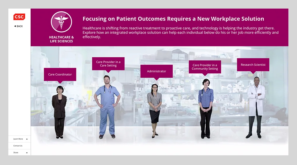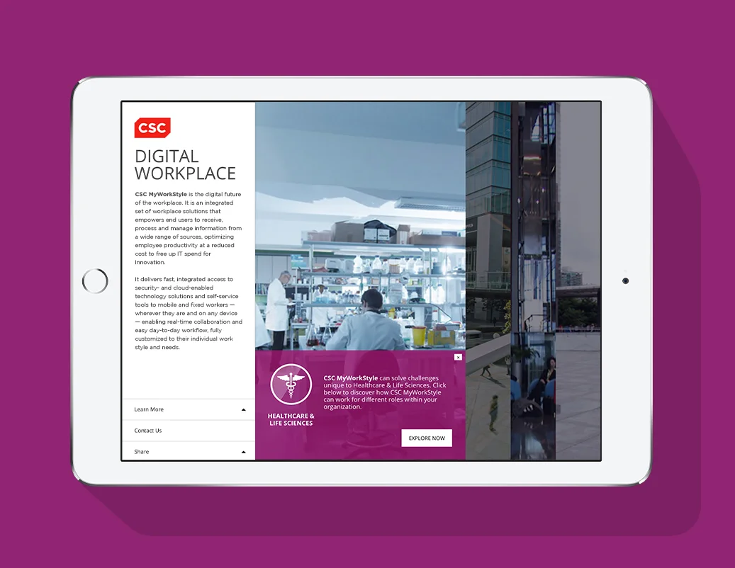 A fully responsive online experience on CSC.com was built to host the videos and provide additional information to users within each vertical.